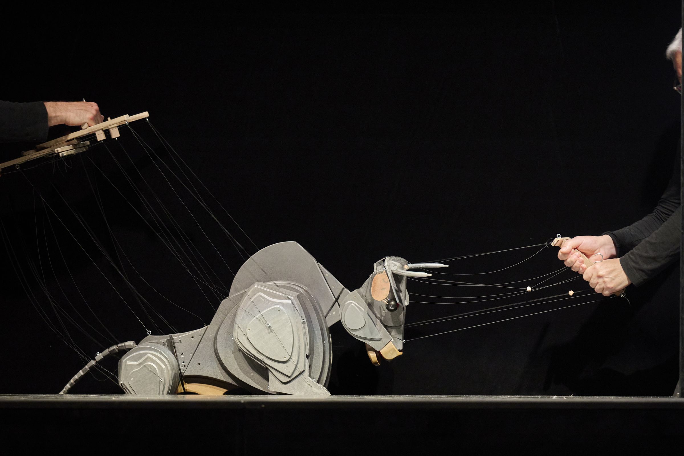 Die Figuren sind mit 1,5 Meter langen Fäden an ihrem Führungskreuz befestigt und werden von Puppenspieler*innen, die zwei Meter über der Bühne stehen, bewegt. Die Beherrschung des Spielkreuzes bedarf großer Fingerfertigkeit sowie jahrelanger Übung und Erfahrung. Die Charakterisierung einer Figur ist der wichtigste Aspekt in der Arbeit der Marionettenspieler*innen. Sie erwecken die Marionetten zum Leben und übertragen durch die Fäden ihre Emotionen auf die Figuren. Die Technik im Umgang mit den Figuren wird ausschließlich am Theater von einer Generation von Puppenspieler*innen an die nächste mündlich überliefert.